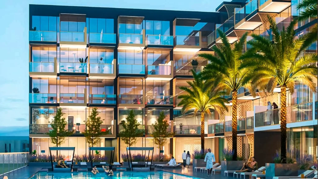 Binghatti Crescent is a 6-storey multi-family house with a one-level parking lot in the basement, where every property owner will be assigned a private spot. This premium complex is designed in a contemporary architectural style. Its exterior features plain geometric shapes and a monochromatic colour scheme, as well as details such as glass façades with panoramic floor-to-ceiling windows and balconies with transparent balustrades. There’ll be two swimming pools, one for adults and one for children, in the inner courtyard. Both will be surrounded by comfortable loungers and ornamental plants that’ll cast a nice shadow on sunny days. Sprawling footpaths for walking and jogging, lush greenery, a landscaped garden, a barbecue area, outdoor sports courts, and a children’s playground are also nearby.